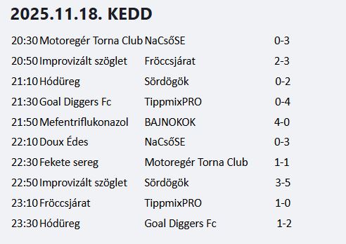 | 23:30 Improvizált szöglet | Goal Diggers Fc 1-1 |